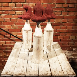 在中國,我看到了很多石窟。每個石窟裡都會有只有洞穴(窟)的。沒有佛像的。或只有頭部被刮掉的,或有佛像存在過的痕蹟的等等。可以考慮到有諸多原因,比如說被異教徒摧毀的,被日軍摧毀的,被共產黨摧毀的,被村民自己搶劫的等等。這段經歷對我來說非常震撼,令人難忘。後來,在中央美術學院時候,我做了“亞當的便器(小便斗)”(2001年),用北京的老木頭來做的作品。這是大約190cm的紅色小便斗,凹的部分可以為我的身體可以坐著寫盤腿。凹痕我不在坐那位置時候更增加了它的存在。那之後,做了有些在其中有東西存在的作品。 “Adamnalu(亞當成)”(2003)就是一個例子。