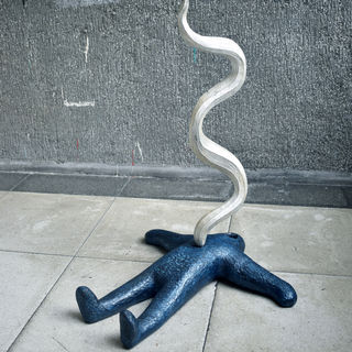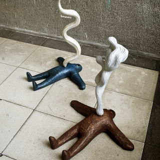 大の字に横たわる体(この五号では身体を立たせています。1~4号までは寝ている状態です。)は、地球、地平線、大地を意識させ、上へと伸びる煙は、昇天を意味しています。魂は体を離れ、天に向かって昇ります。しかし、煙は、その意味とは別に、人間の欲望をあらわにします。欲望はとどまるところを知らず、原爆のきのこ雲、福島原発爆発の煙にまで拡大されました。人間からにじみ出る欲望の象徴が、この煙となって昇っていく。そんな情景です。
